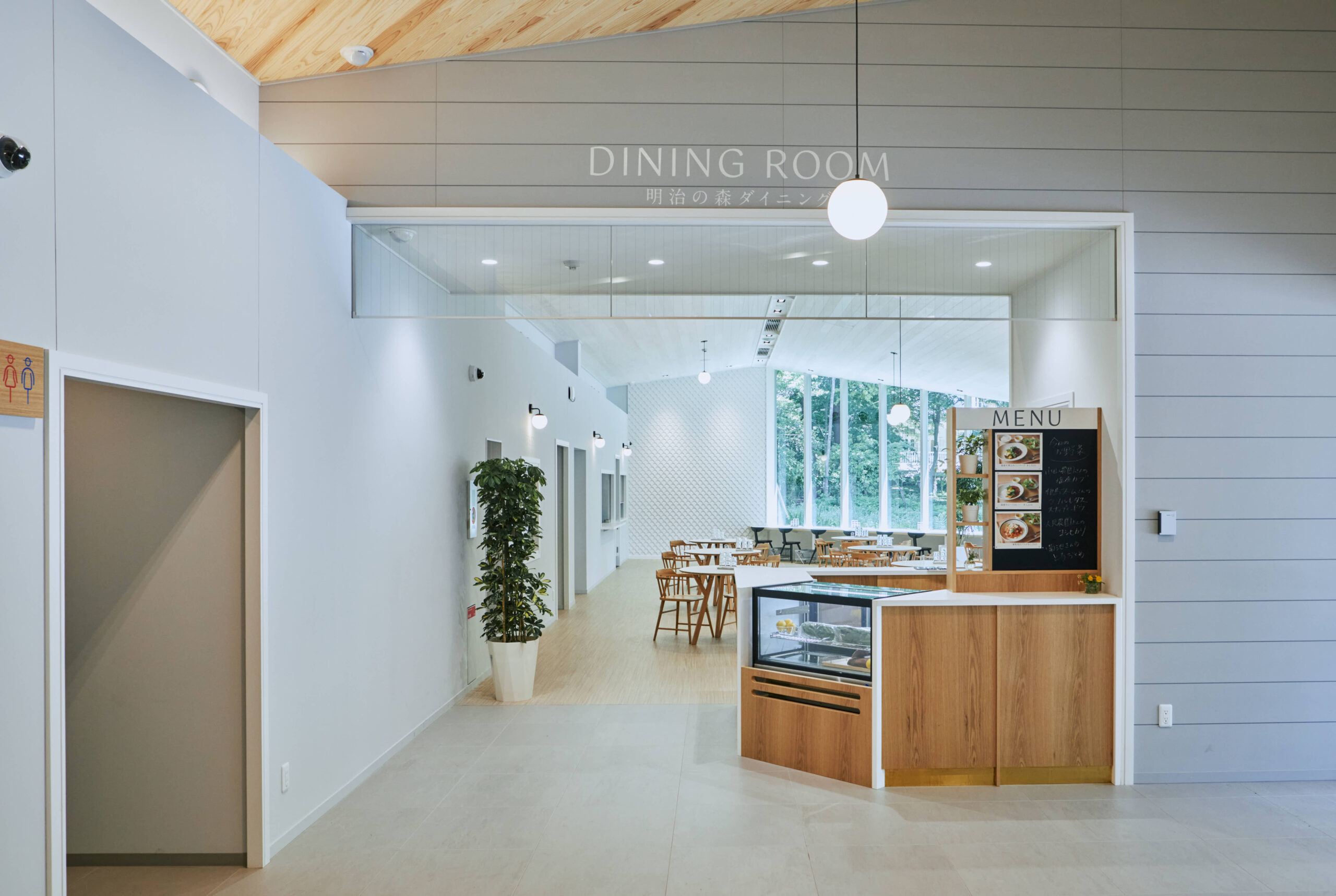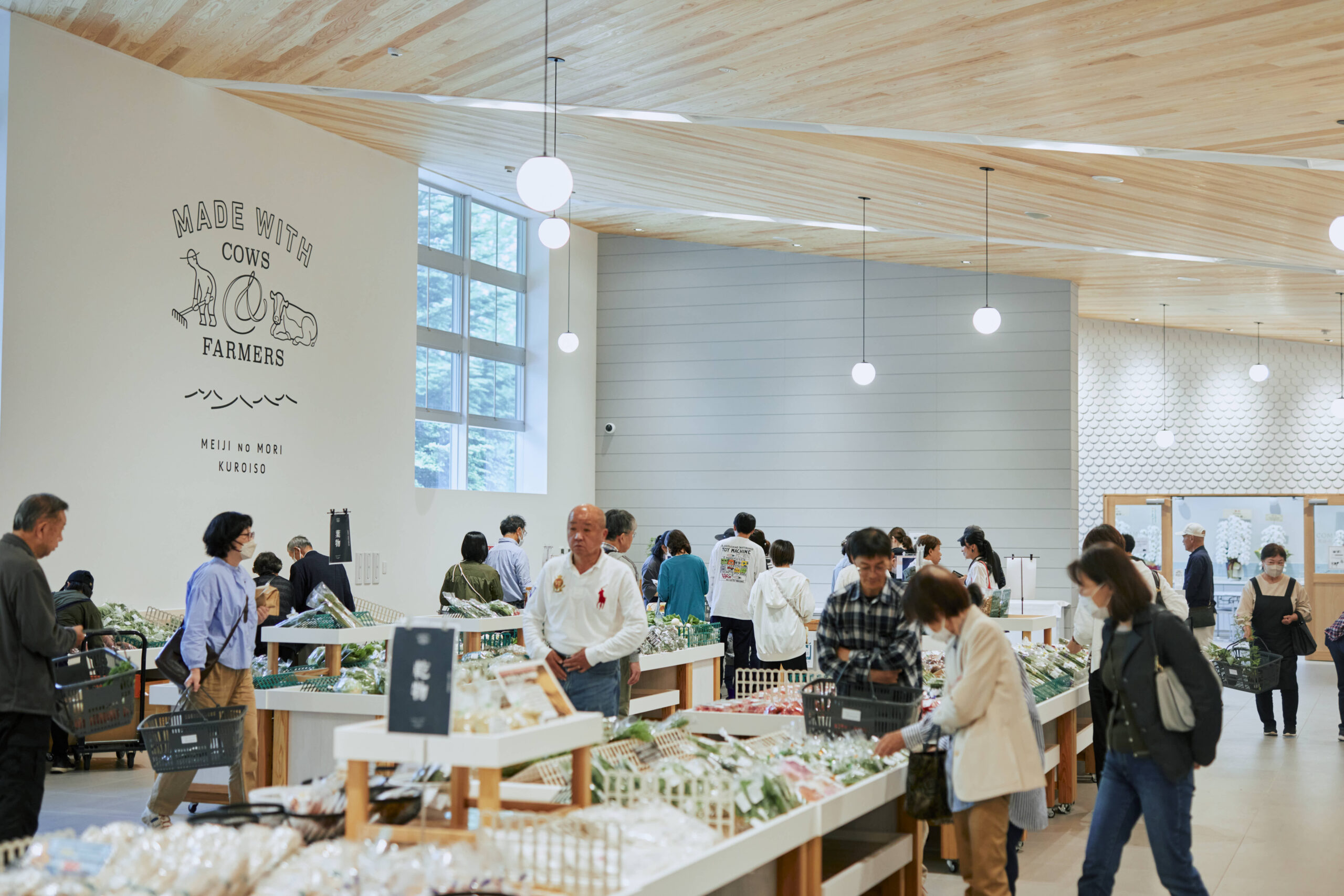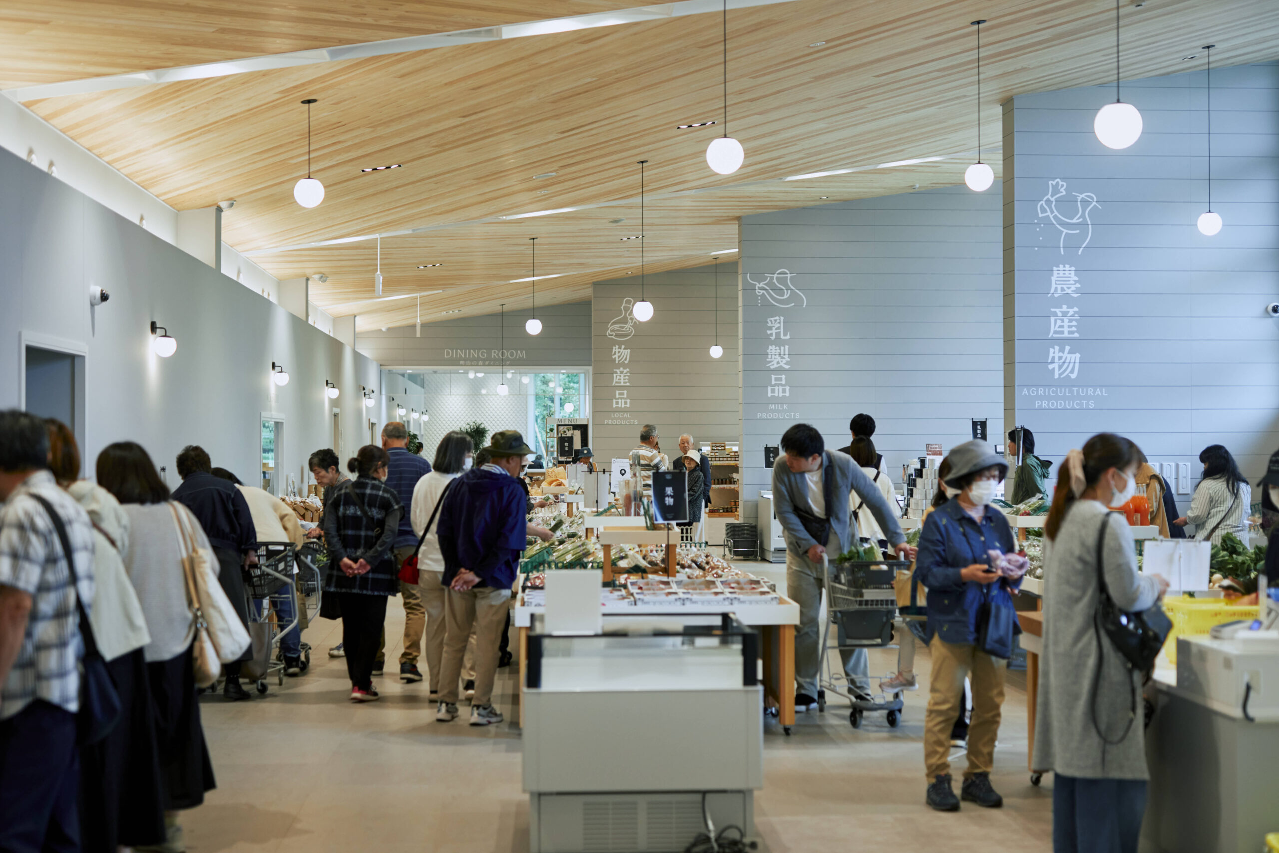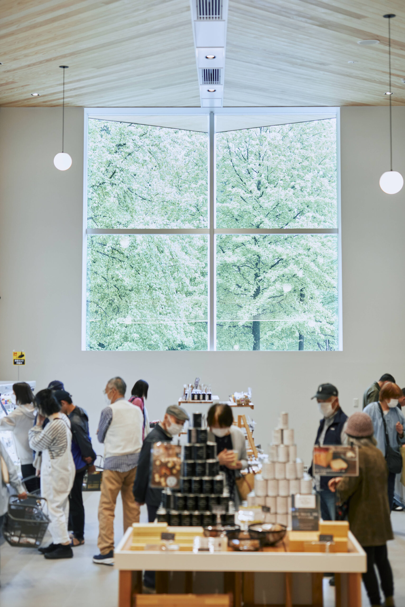 内部の「明治の森マーケット」には外部庇と連続するように杉板の勾配天井がつながる。内外連続する壁が各コーナーを緩やかに分け、空間に躍動感を生む。開口は多様な商品レイアウトを可能にするため、床面から2mの高窓とし、庇に守られた高窓からは、豊かな木々が覗く。