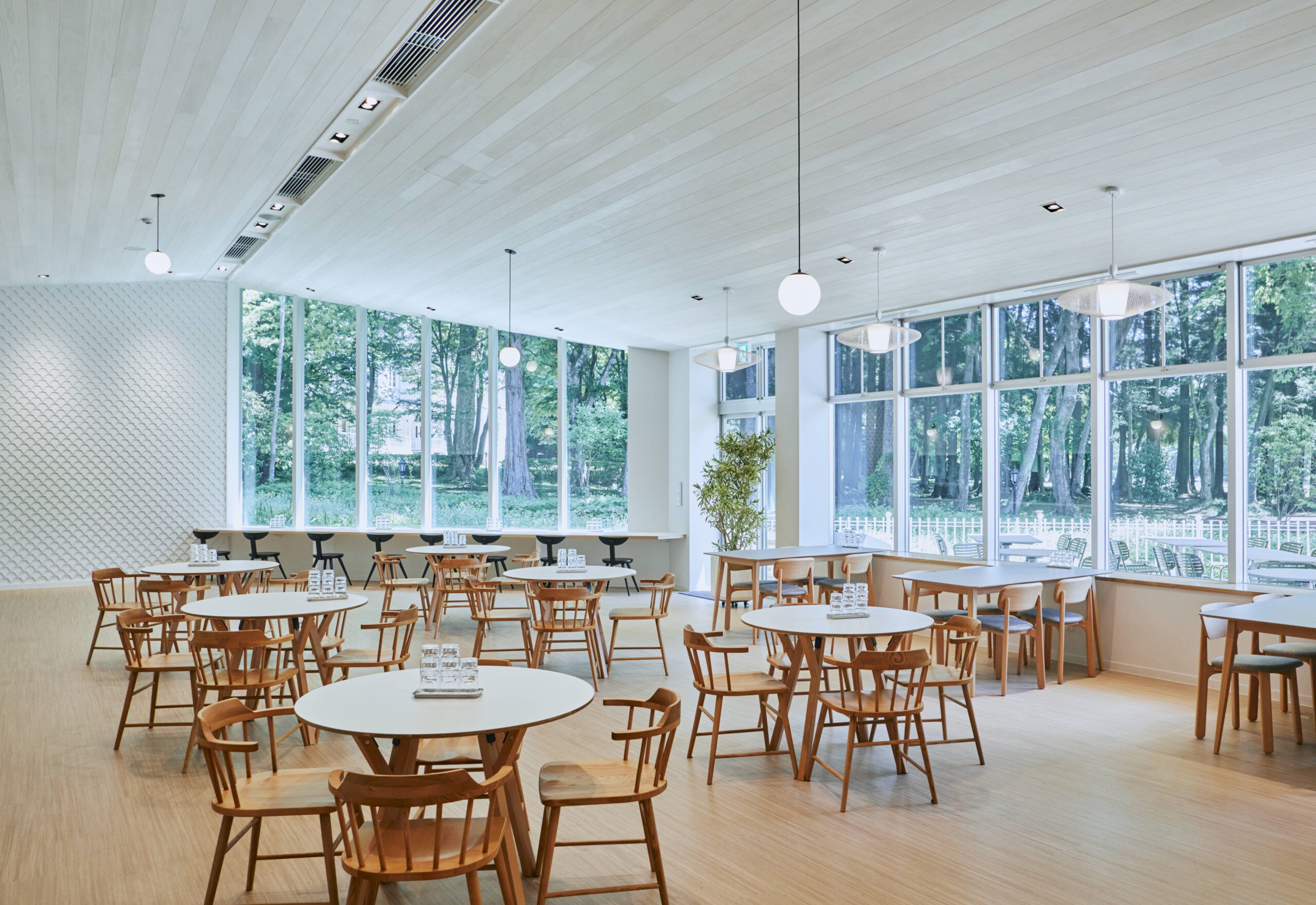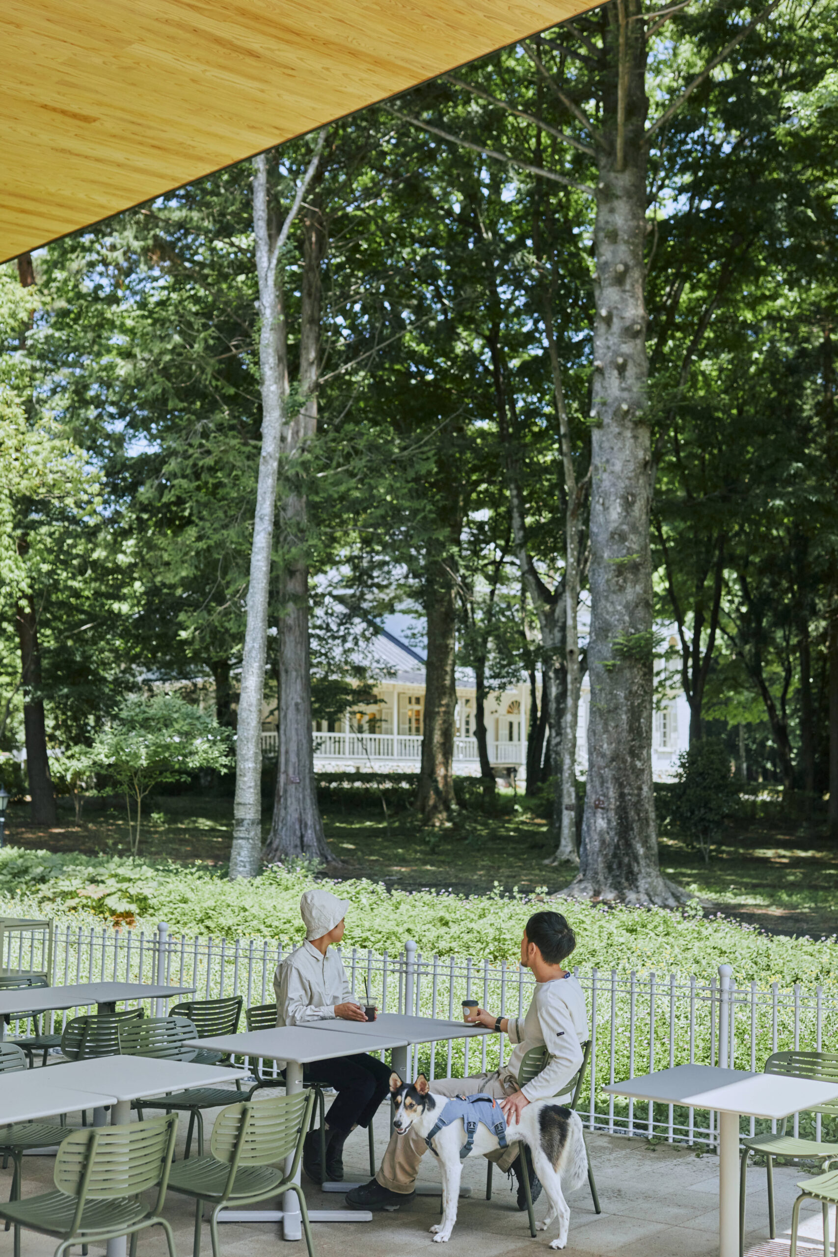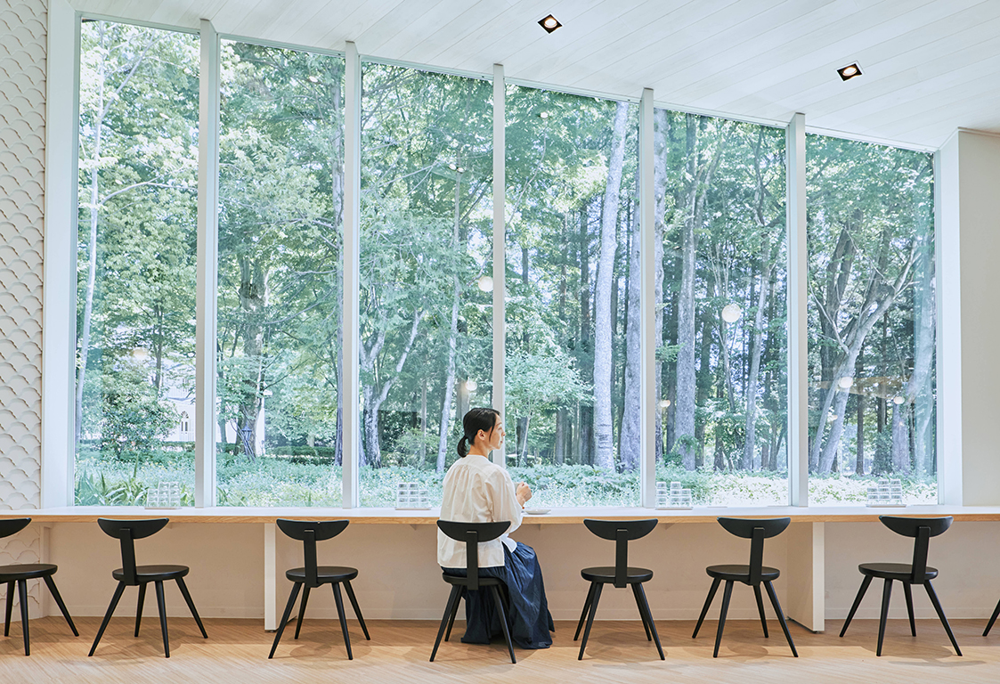 連続する「明治の森ダイニング」からは旧青木家那須別邸が眺められる。緑豊かな森へとつながる庇の下にはテラス席を設けた。くつろぎながら那須塩原産の食事を楽しめる。