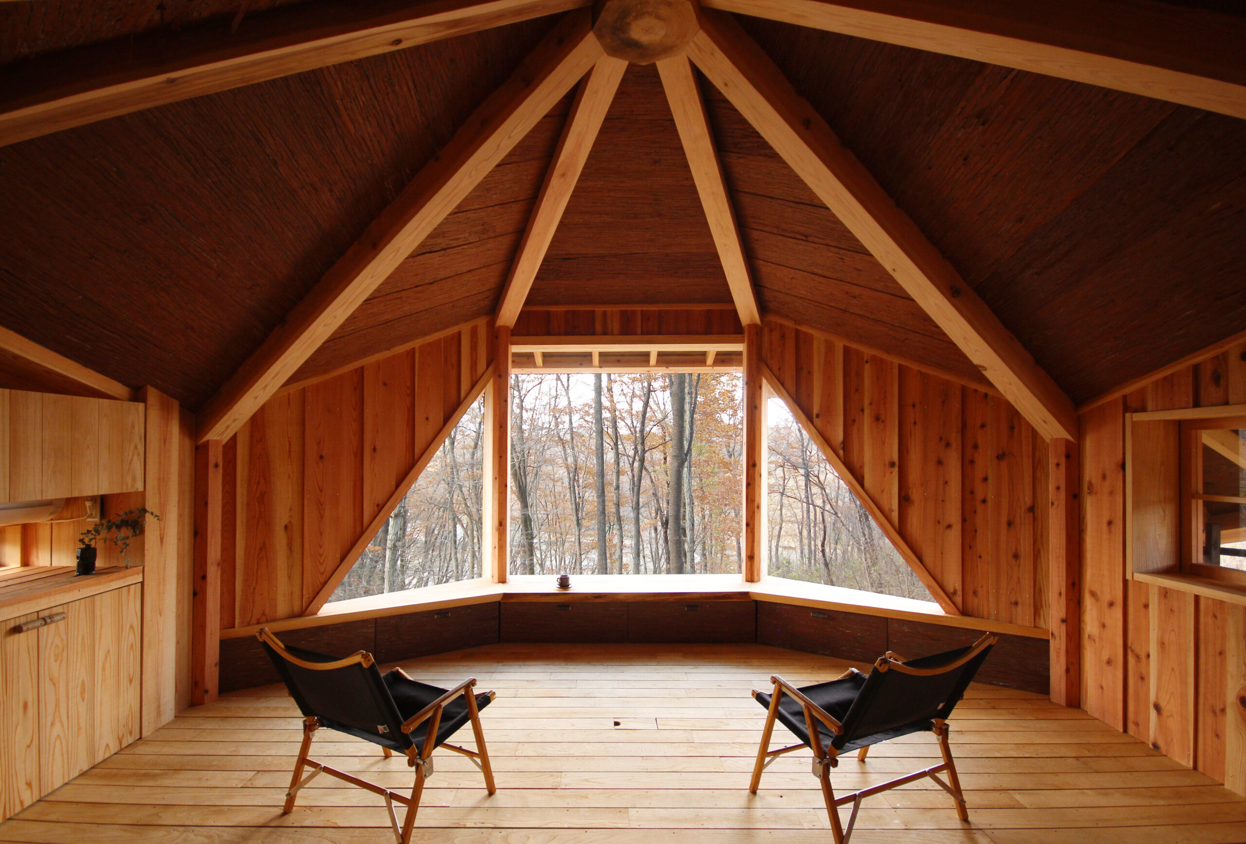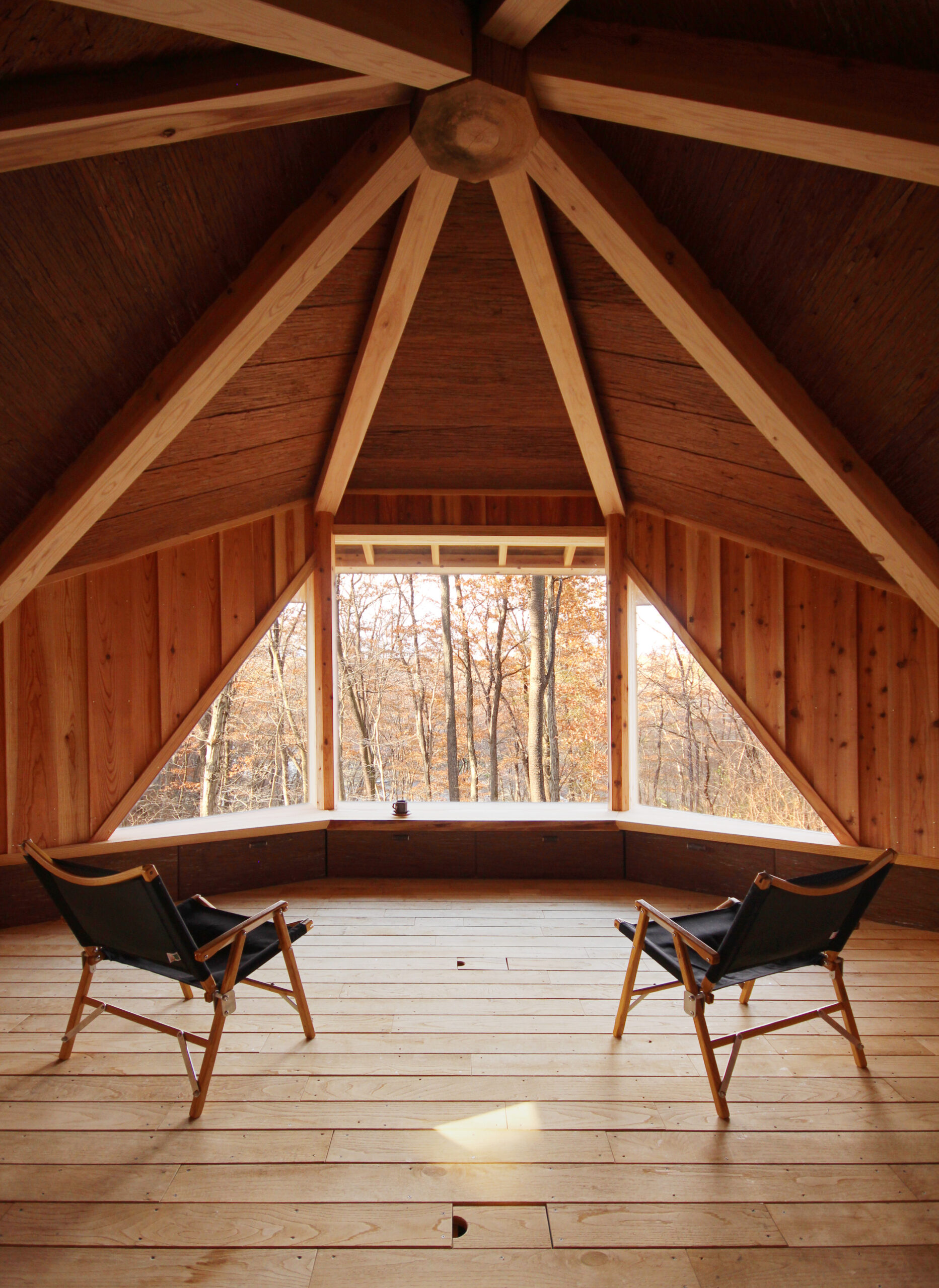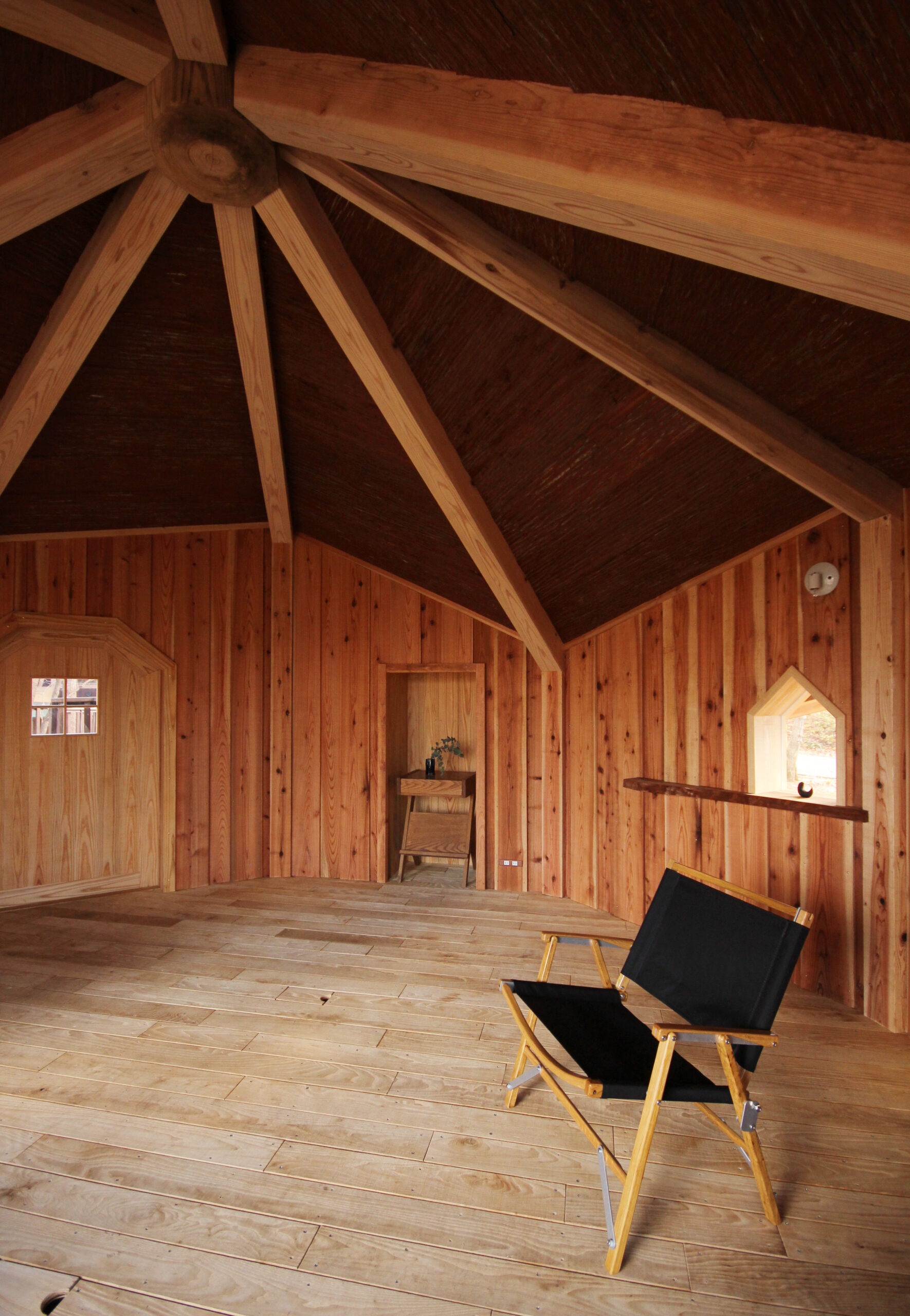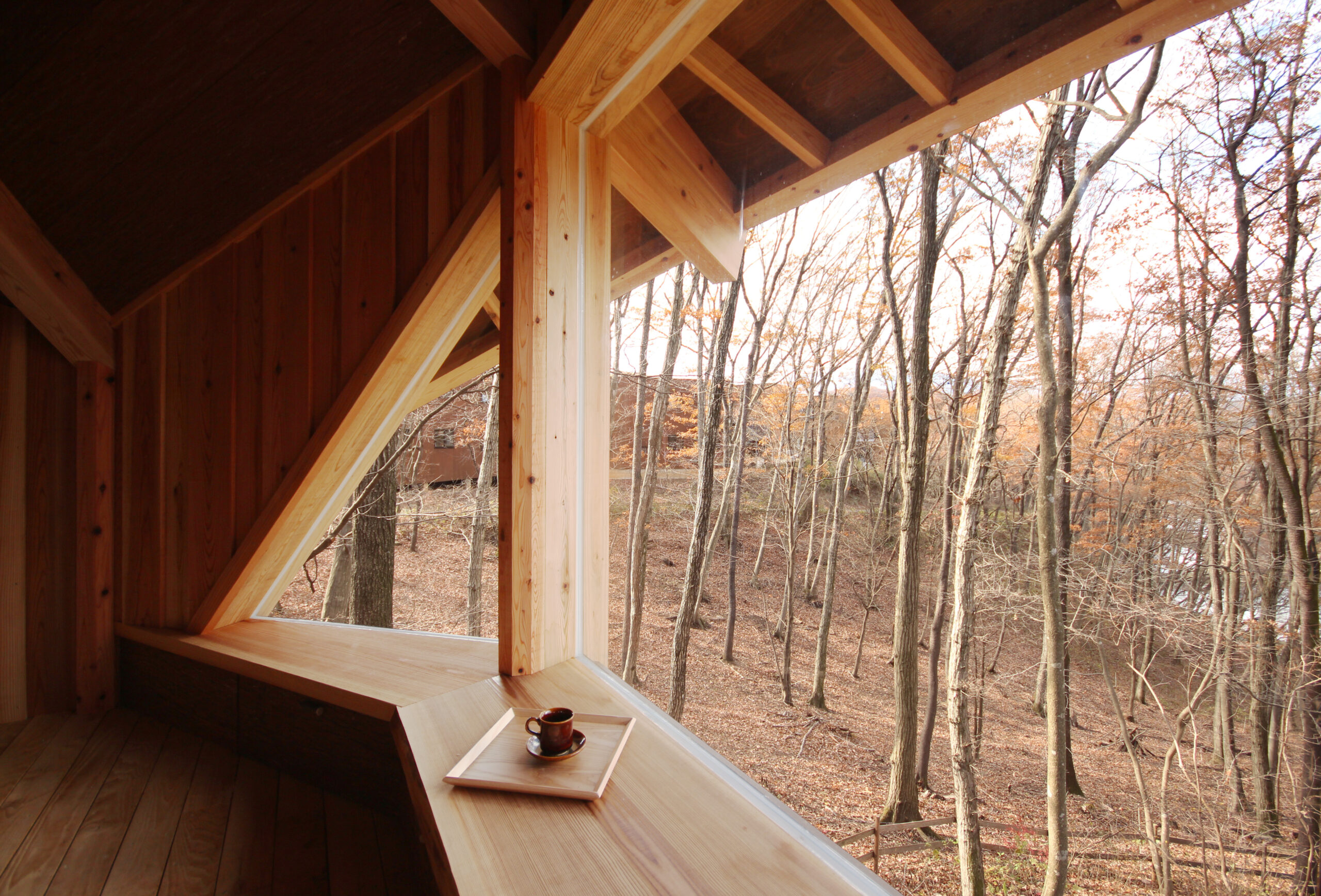 躙口のように高さをおさえた入口を抜け、空へ、森へとつながる。