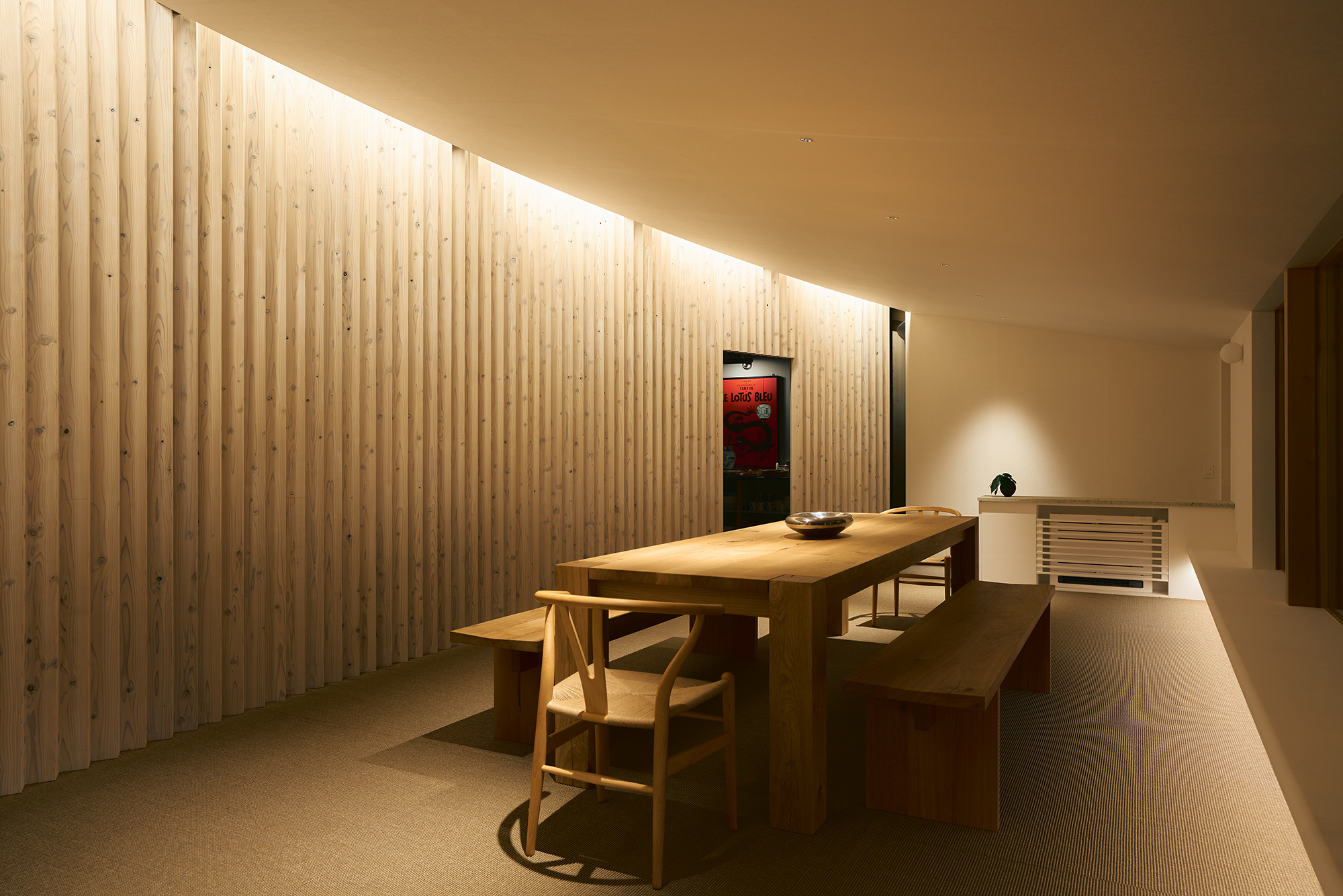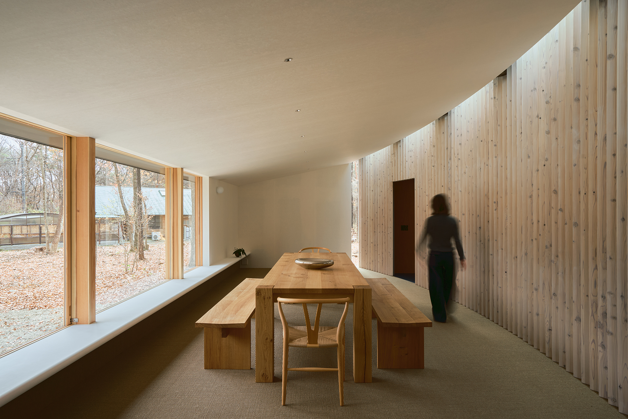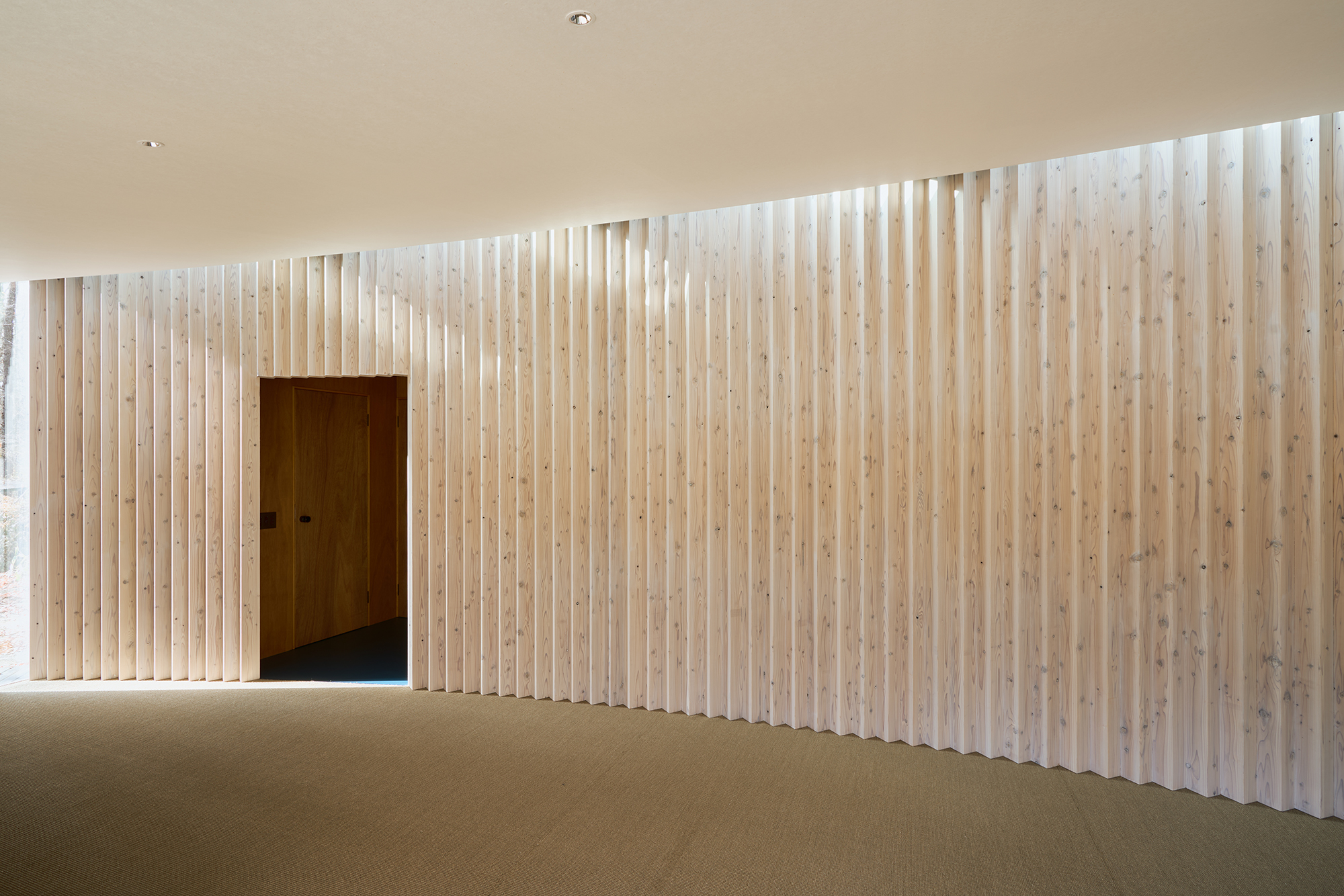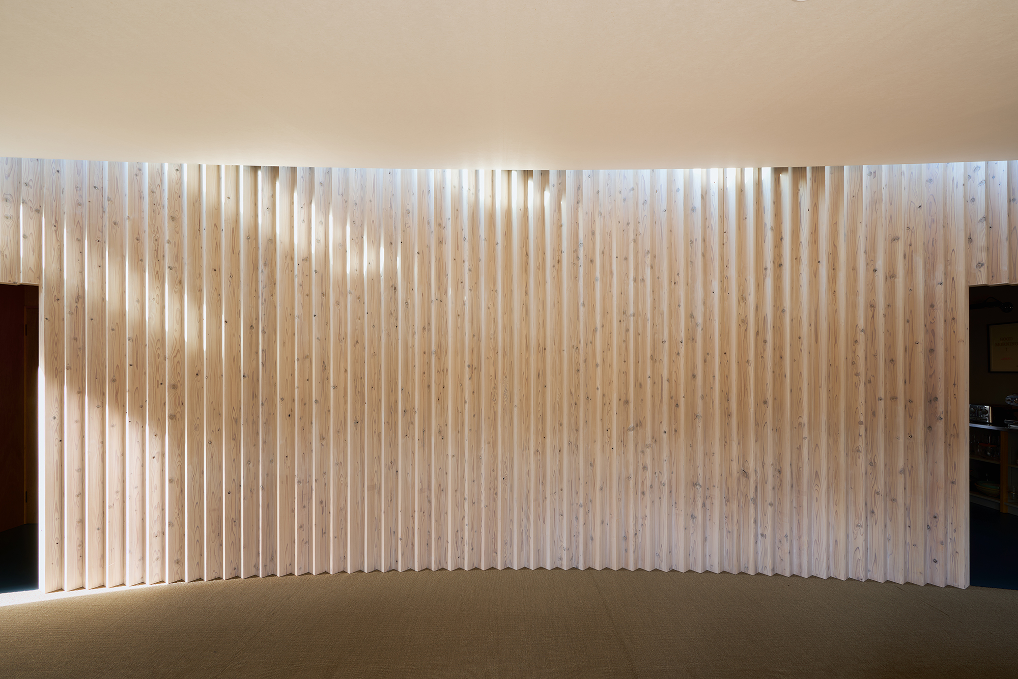 天窓から差し込む光は、湾曲壁に抑揚を与え、時を告げる。
