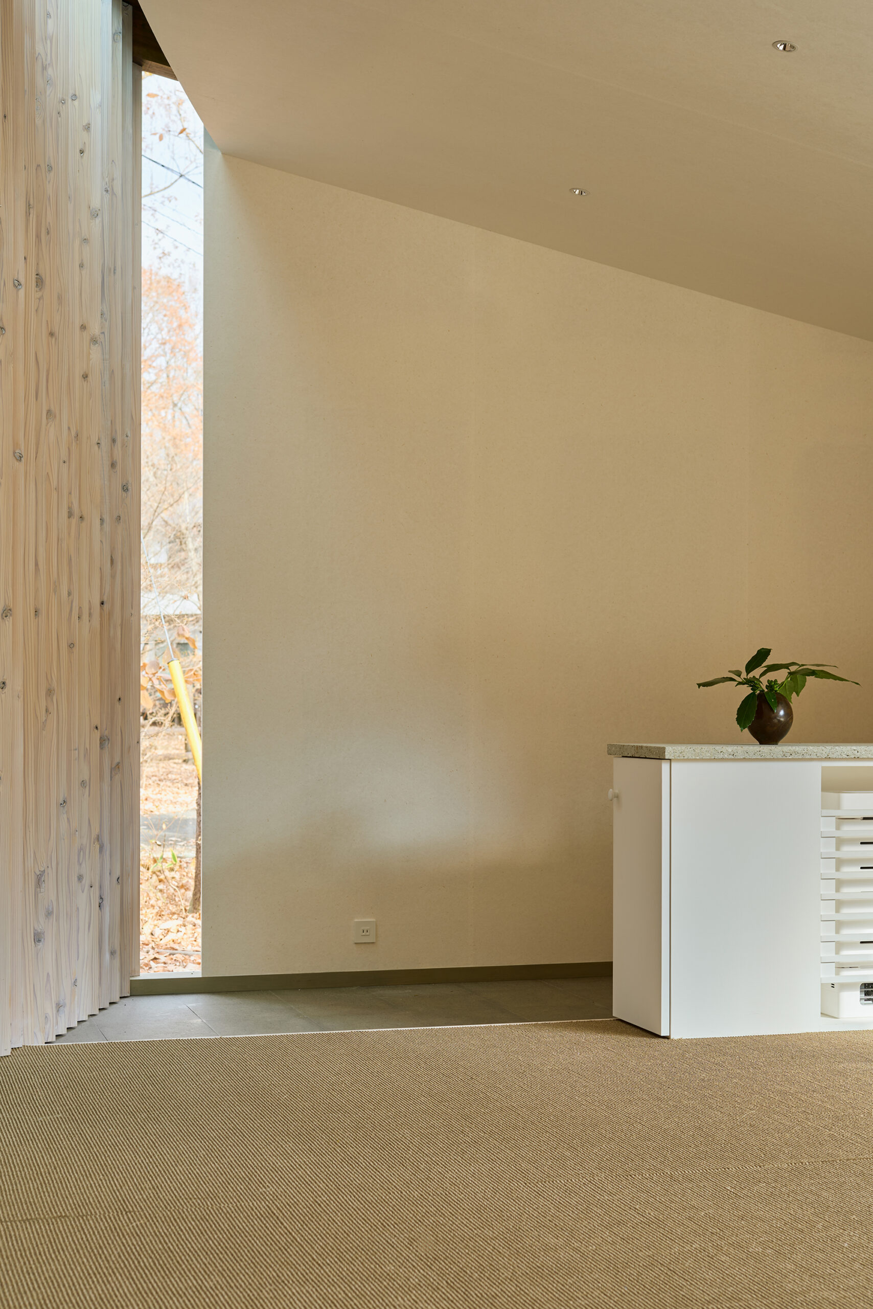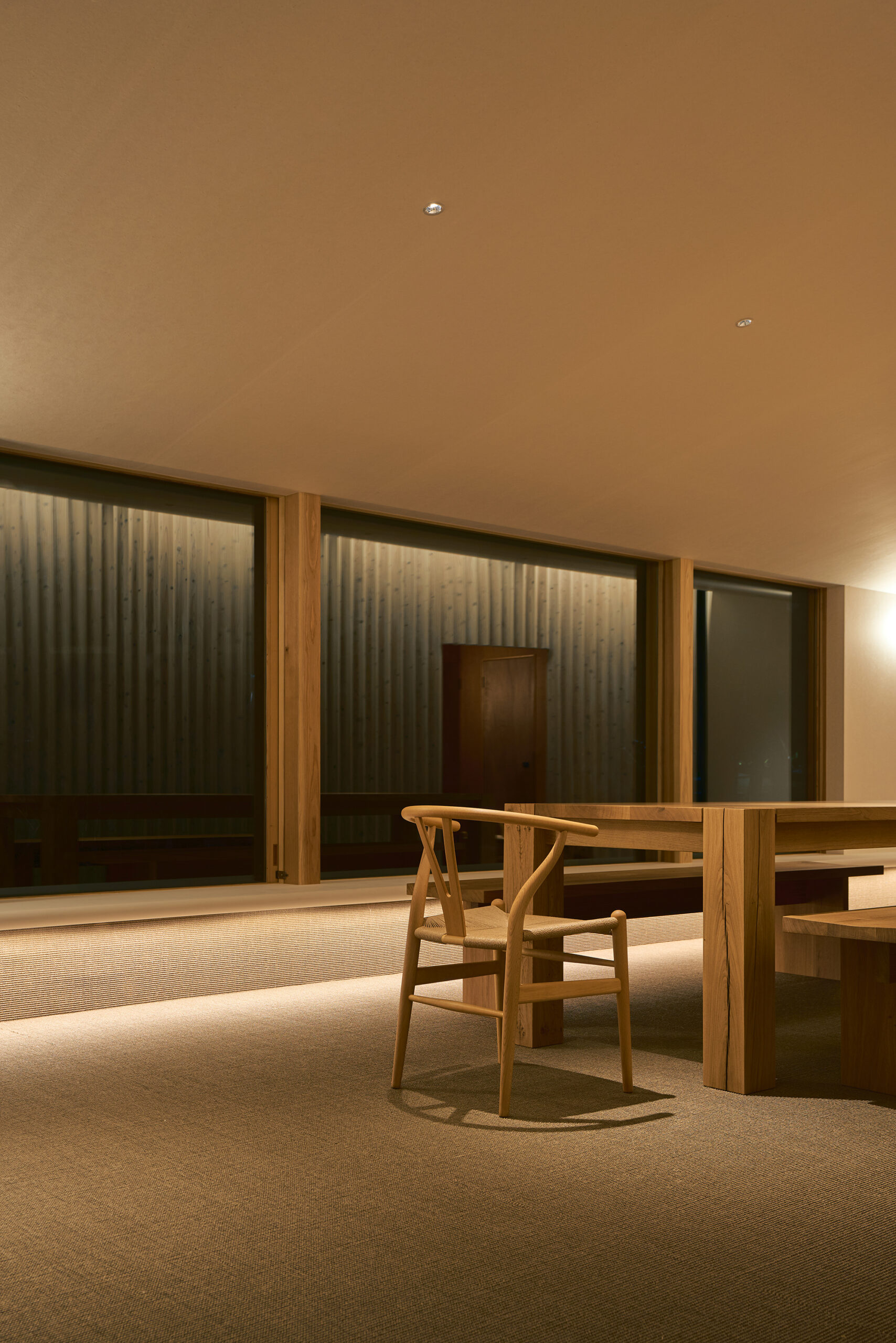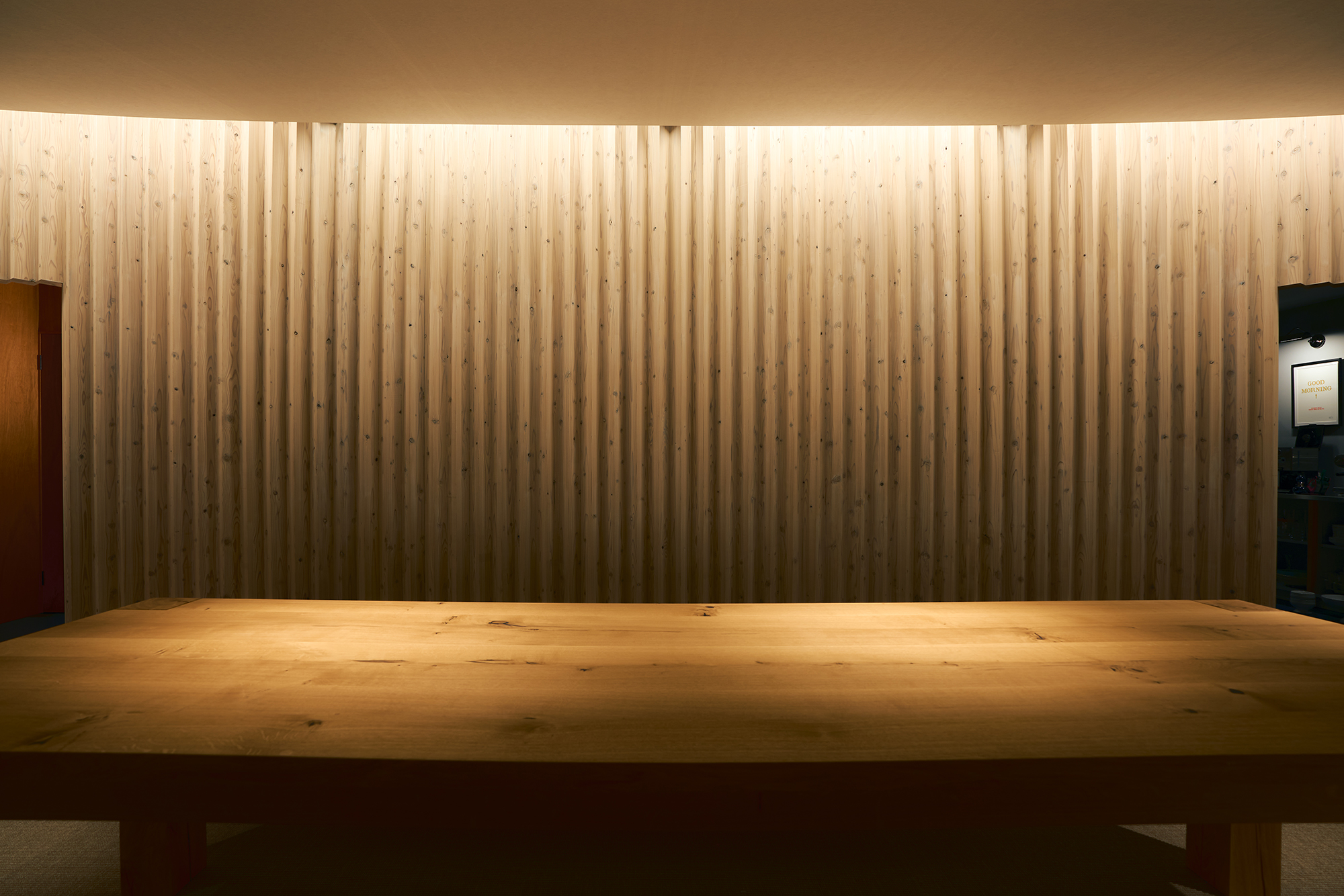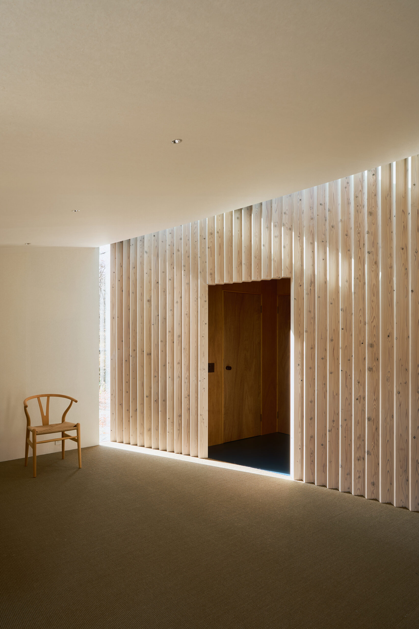天窓から差し込む光は、湾曲壁に抑揚を与え、時を告げる。