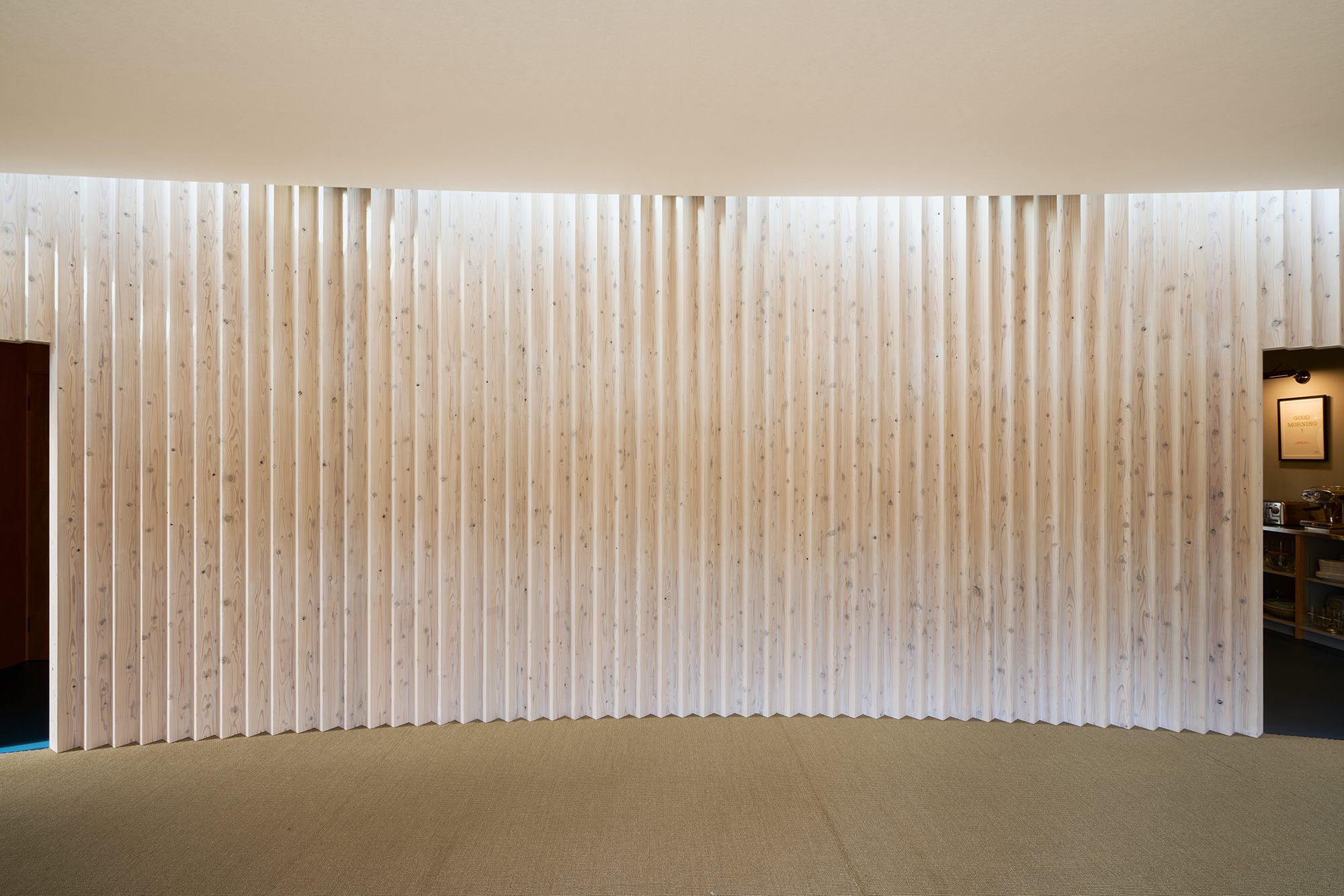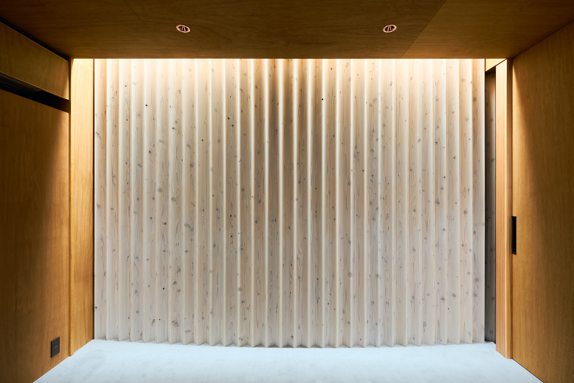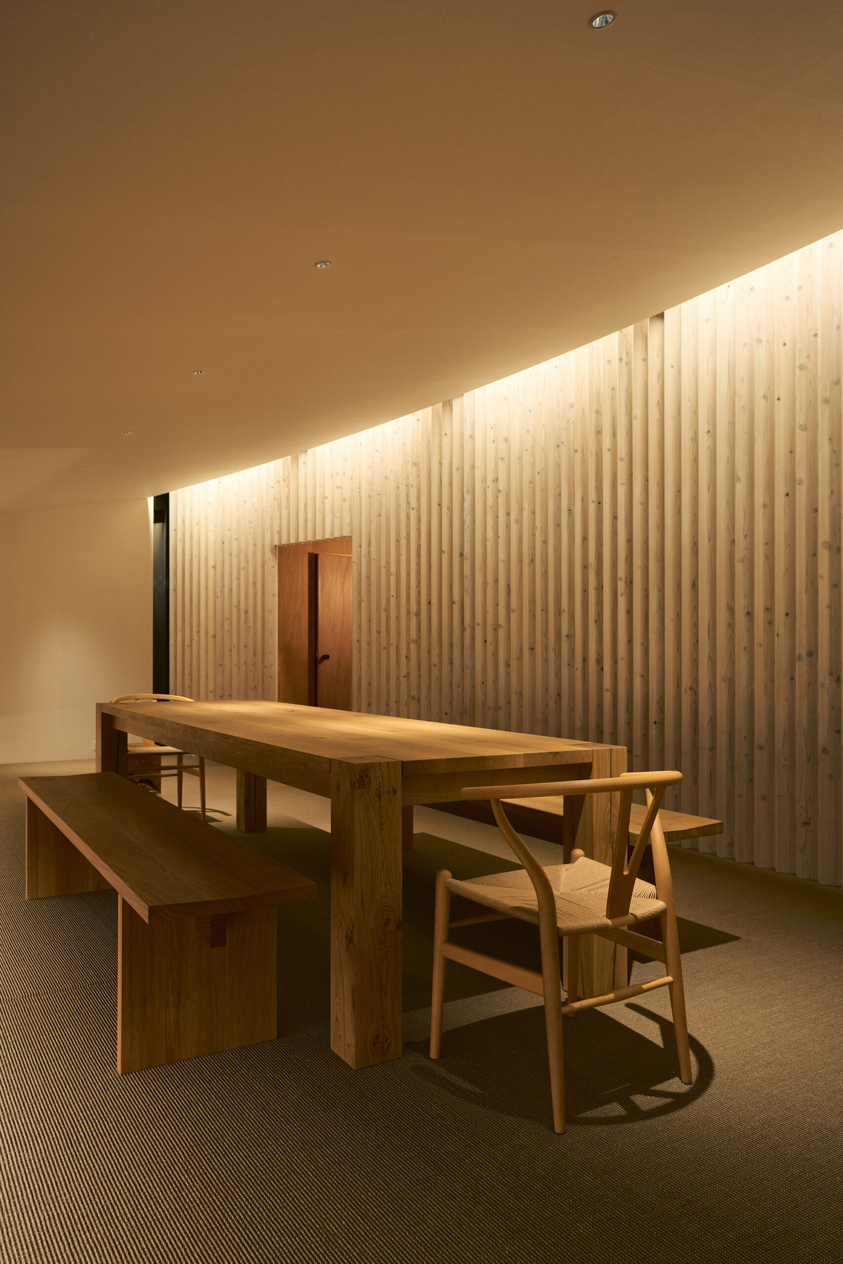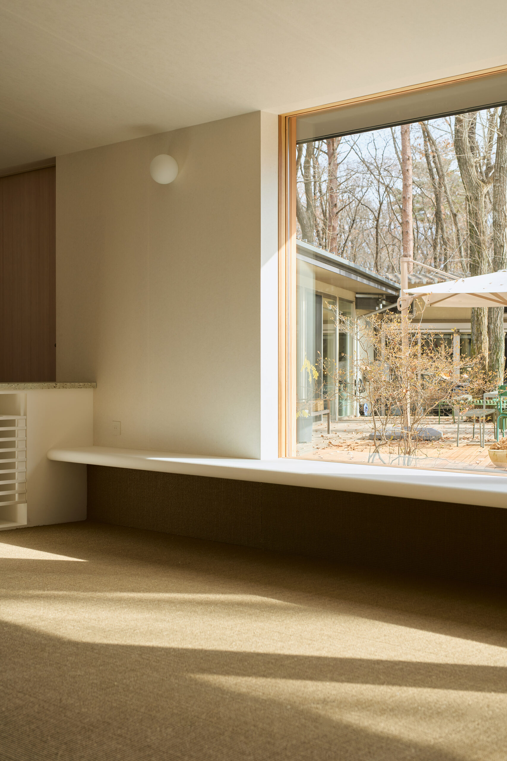 天窓から差し込む光は、湾曲壁に抑揚を与え、時を告げる。