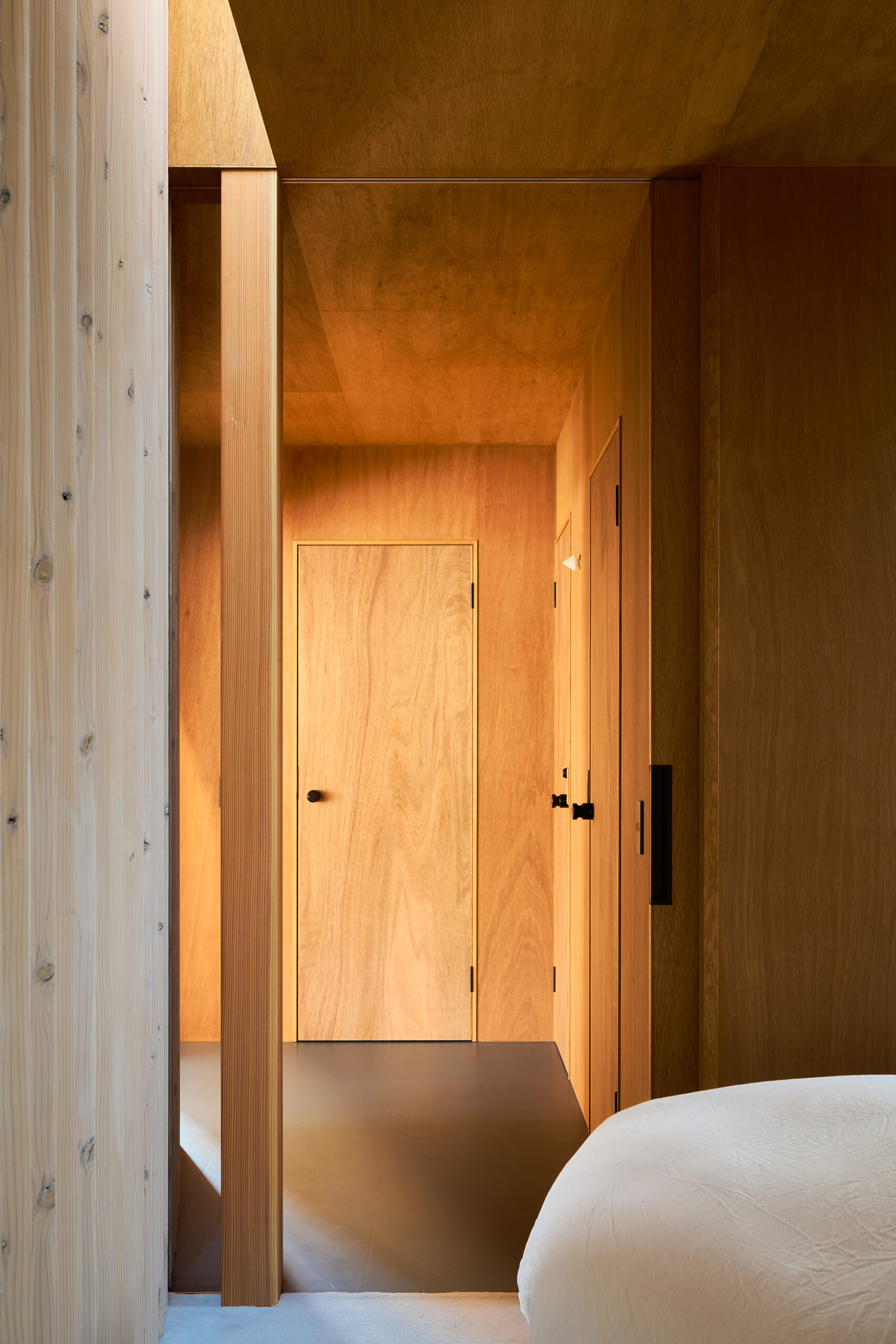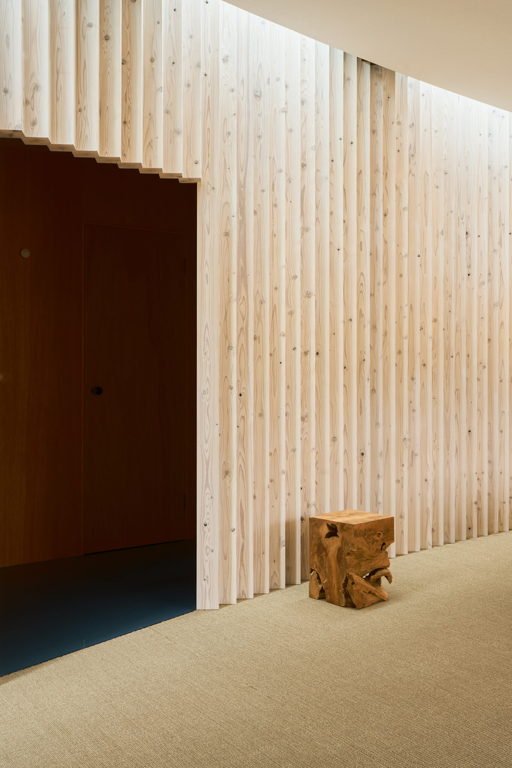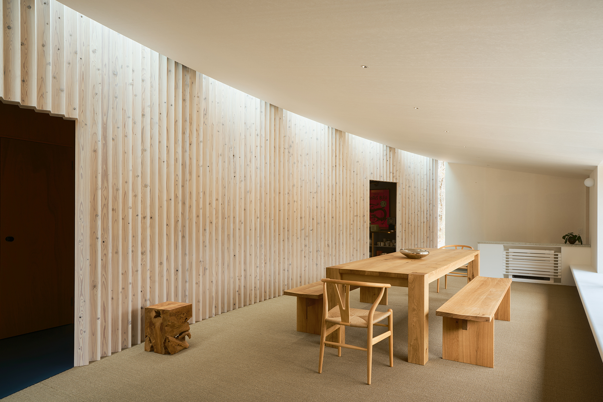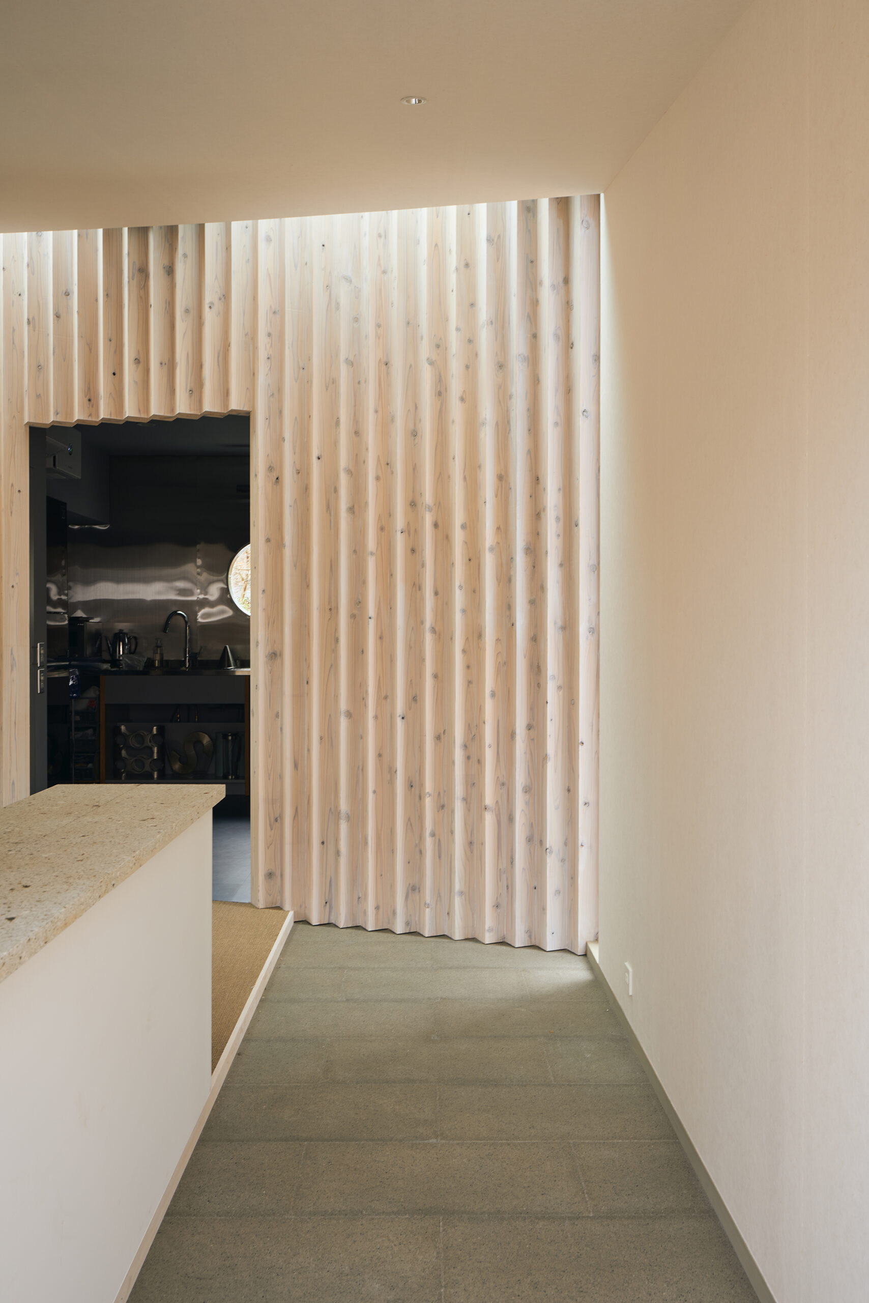 天窓から差し込む光は、湾曲壁に抑揚を与え、時を告げる。