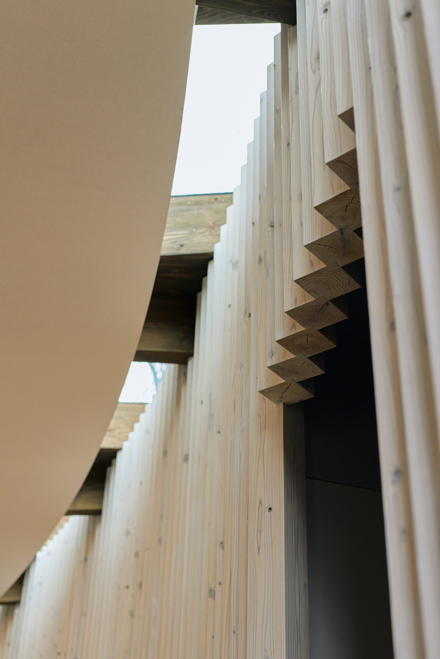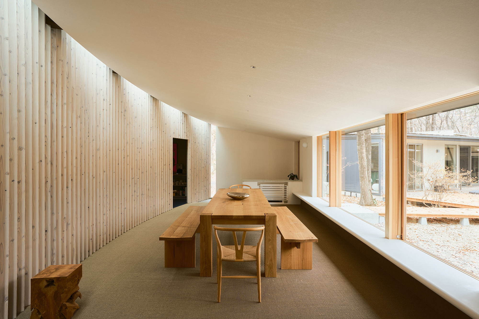 林を囲むような緩やかな曲線を引き、3.5寸柱を用いた湾曲壁を形成した。