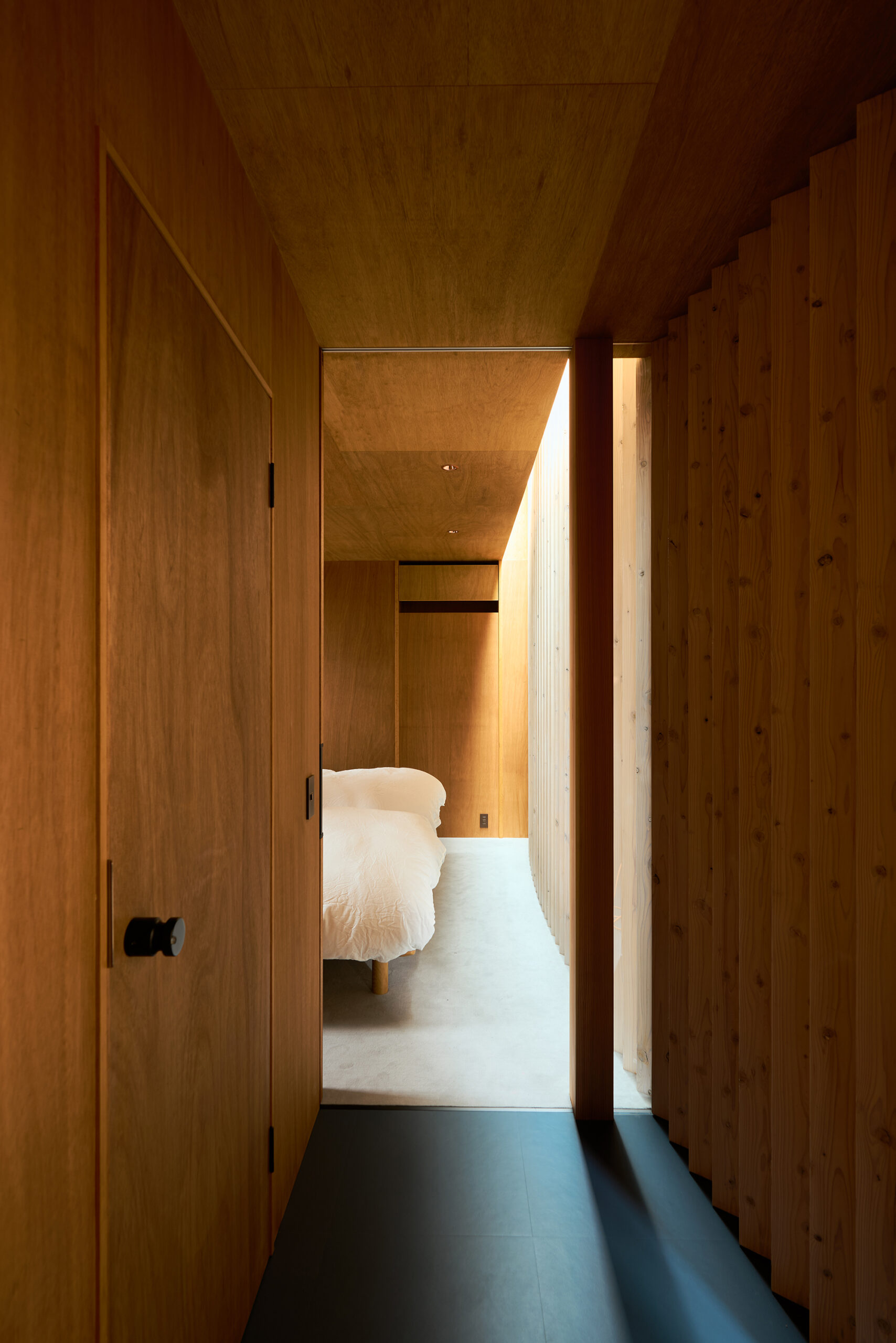 林へと大きく開いたリビングと諸室を分け、明暗をつける。
